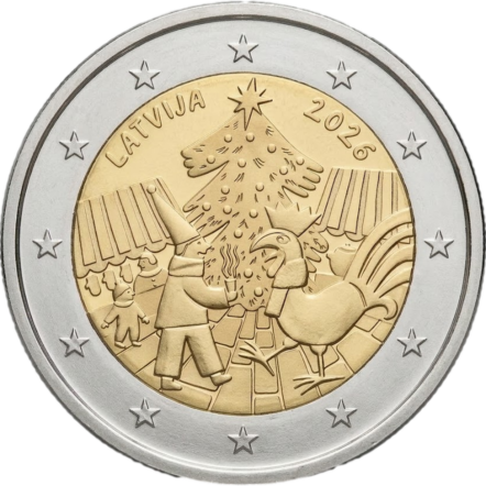 Die 2-Euro-Welt ist um ein kurioses Motiv reicher: Die lettische 2-Euro-Gedenkmünze 2026 trägt das Thema „Weihnachtsmarkt-Tradition“. Nach der bislang veröffentlichten Motivbeschreibung zeigt sie eine Weihnachtsmarktszene mit Buden, einem großen Weihnachtsbaum in der Mitte, einer Person mit heißem Getränk auf der linken Seite sowie dem gekrönten Wetterhahn der Rigaer Domkirche auf der rechten Seite. Am oberen Rand stehen „LATVIJA“ und die Jahreszahl „2026“.
